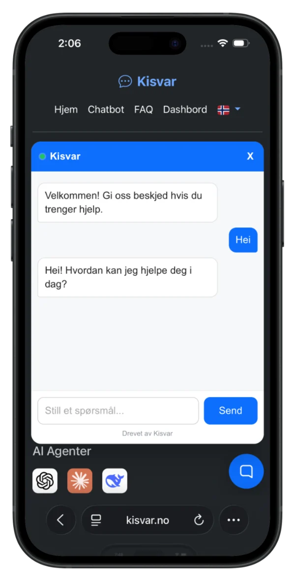 Kisvar er en AI-chatbot for nettside som håndterer kundespørsmål automatisk, slik at du kan fokusere på å drive bedriften din. Enten du driver en nettbutikk, et SaaS-produkt eller en lokal bedrift, kan du legge til Kisvar live på nettsiden din på minutter.